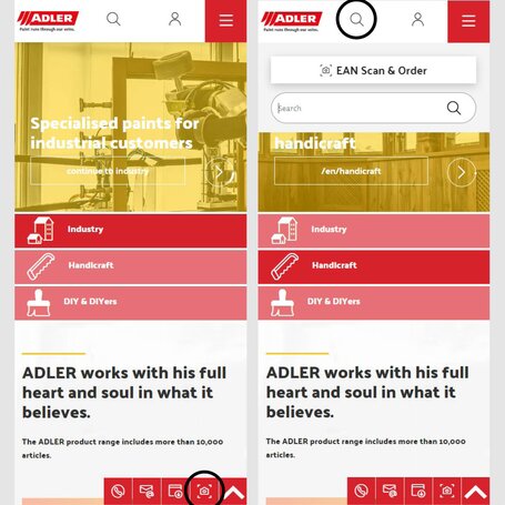 • Or by clicking on the search (the magnifying glass icon) in the white header menu. Above the search bar you will then find a button called "Scan & Order EAN", which will take you to the scanner app. (Figure 2)