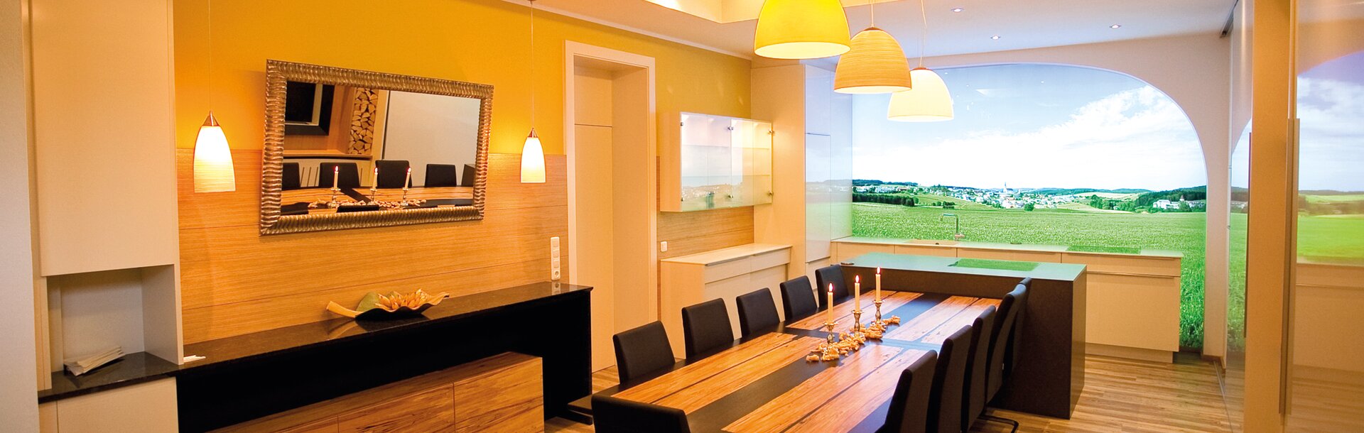Mit einer großen, hinterleuchteten Glaswand ist es uns gelungen, den Kellercharakter komplett verschwinden zu lassen“, sagt Katzmaier. Der Raum fasziniert nun mit dem prächtigen Panorama des idyllischen Reichenthals – fast wie ein Blick aus dem Fenster. Zeigen will das „Katzmaier Einrichtungsteam“ den Kunden dort aber auch, was mit verschiedenen Materialien und kreativen Ideen alles möglich ist: „Die großen Fronten haben wir mit ADLER Pigmopur cremefärbig lackiert und sie mit ADLER Legnopur G90 zum Glänzen gebracht. Darüber kam noch eine Schicht ADLER PUR-Antiscratch HQ für die höhere Widerstandsfähig- und Kratzfestigkeit“, schildert die Tischlerin, die vor zehn Jahren den Betrieb ihrer Eltern übernommen hat. Nun versammeln sie und ihr Team sich oft um das Herzstück des neuen Raums: Der große, variable Tisch beeindruckt durch die elegante Kombination von Räuchereiche und Trüffelbuche. „Wir haben die Teile mit einem neuen Verfahren verleimt, um den herrlichen Effekt der natürlichen Furnierblattränder nicht zu verlieren“, erklärt Katzmaier. Diese frisch-freche Kombination einer schlichten und einer auffälligen Holzart setzte sie auch für die weiteren Möbel ein – und lackierte abermals mit ADLER Legnopur G90.