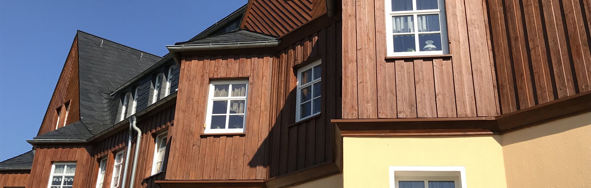 Die Eigentümergenossenschaft entschied sich für die aufwändigere, aber hochwertigere Variante. Also hat der Malerbetrieb Salzer die Fassade zuerst aufgehellt mit Pullex Renoviergrund im Farbton Beige. Jetzt war es vorbei mit dunkel und düster und das Fichtenholz war wieder fit für einen hellen, lasierenden Anstrich: Dieser erfolgte mit Pullex Top-Lasur im Farbton Kastanie. „Alle Bewohner und auch der ausführende Maler sind mit dem Ergebnis sehr zufrieden“, berichtet Michael Rausch. „Aus dem Schreckenshaus im Erzgebirge ist ein schmuckes Schlösschen geworden, wie es sich gehört“, lacht er.