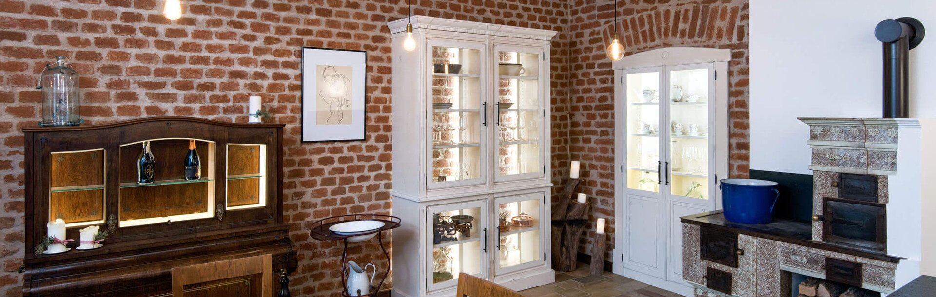 Am Beginn des Umbaus stand ein besonderes Erbstück: Eine 200 Jahre alte Holzdecke, die ursprünglich aus dem eigenen Wohnhaus stammte, wurde gebürstet, gewachst und im benachbarten Firmengebäude wieder eingebaut. Mit der sichtbaren Ziegelwand und dem Steinfußboden war die Atmosphäre für „Urgroßmutters Küche“ perfekt. „Aus einem anderen Nachbarhaus haben wir einen 300 Jahre alten Herd ausgebaut und bei uns neu aufgesetzt. Dann galt es, die dazu passenden Möbel zu gestalten und zu fertigen“, erinnert sich Martin Polleross.