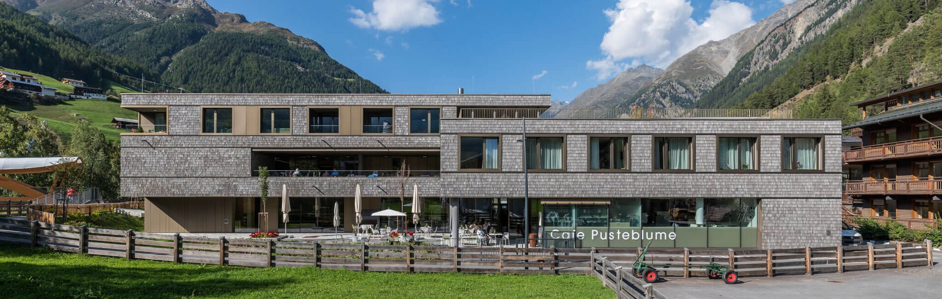 Die Fassade ist der Inbegriff des „Alterns in Würde“: bedeckt von traditionellen Tiroler Fichtenschindeln, wie sie seit Jahrhunderten ehrwürdige Bauernhöfe genauso wie kleine Stadel zieren und vielen Bewohner/-innen sicherlich schöne Erinnerungen bescheren. Natürlicherweise ergrauen die Schindeln im Alter nicht nur, sondern „versilbern“ sogar – allerdings je nach Wetter- und Sonnenexposition ungleichmäßig. Beim Sozialzentrum Sölden hat der Traditionsbetrieb „Astner Holzschindeln“ daher etwas nachgeholfen: Alle 60.000 Schindeln wurden vor dem Verlegen in Pullex Silverwood im Farbton Aluminiumgrau getaucht. So strahlen sie von Anfang an in edlem Silber und sind zudem vor Schädlingen und ungleichmäßiger Abwitterung geschützt. Auch das ist eine Konsequenz aus dem Gedanken, Ressourcen zu schonen und nachhaltig zu arbeiten.