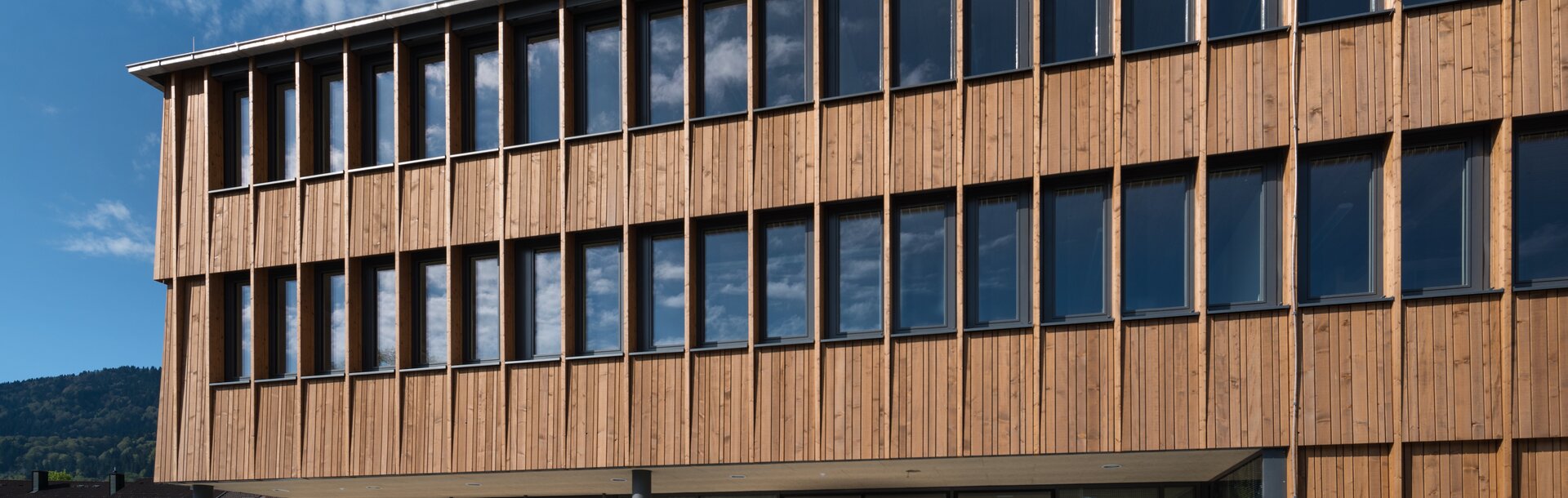 The outer appearance of the Grüne Zentrum Immenstadt is equally striking and linear, lively and elegant. The facade is not made as usual out of large, smooth areas, but instead is vertically divided by deep, narrow posts. This creates an interplay of light and shadow, which makes the facade look vibrant and never the same. It owes its elegant look to the wood glaze, ADLER Pullex Silverwood in the colour Fichte hell geflämmt. Klaus Kerler, owner of the company Lignum-Finish, was responsible for coating the facade. As he explains, not only did Kerler select the colour to match the surrounding houses: “The colour of the facade is supposed to underline the natural quality of wood as a building material.