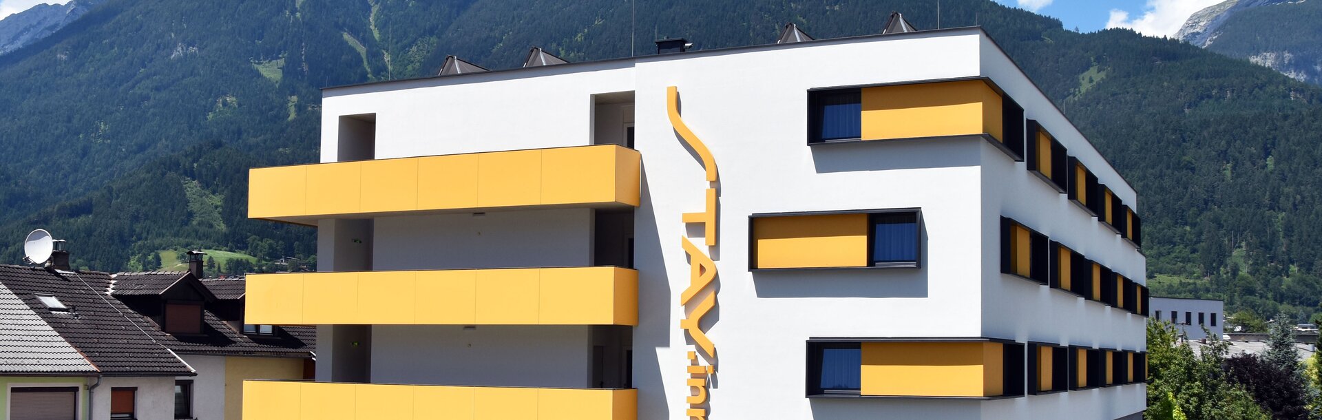 Anyone who comes here is happy to stay. Or come again. For exactly eight years, the STAY.Inn Hotel has provided all those coming to Schwaz a place to stay. With modern design, stylish furnishing and unique service including 24-hour check-in, the hotel scores well among business travellers and tourists alike. Strong and light colours in an elegant combination convey a friendly, inviting impression - even at first glance: because the light grey facade with the bright yellow balconies, the hotel sign in the same colour and the matching shutters makes the sleek, cubic building a real eye-catcher.