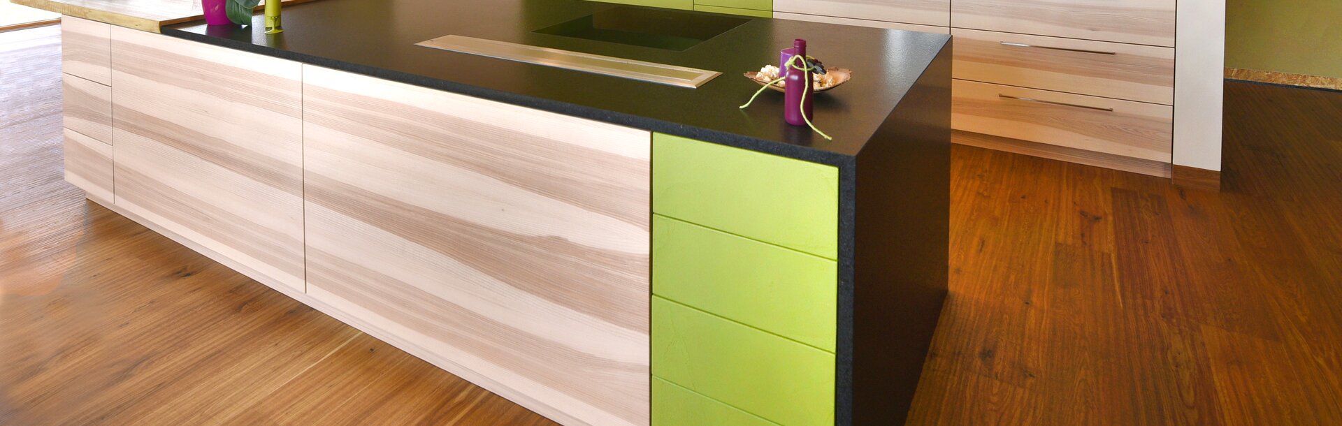 The three-ply core ash panels were elegantly brightened with ADLER Spritzbeize, whilst the top coat of ADLER Ventopur in gloss level G10 ensured good resistance properties. They thus represent a harmonious addition to the Betoneffekt surfaces in the special light green colour, which rounds off an elegant, deep black work surface. “In this area we were able to rely on the competent advice of stonemason, Richard Ehrlich,” says Martin Heilos. The carpentry firm works with him on a regular basis – after all, exclusive kitchens are among the most sought-after products made by Heilos.