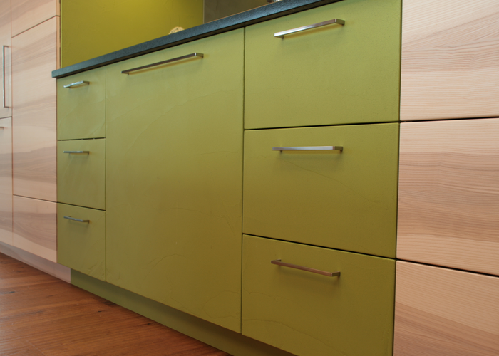 His ADLER sales representative, Johann Daxbeck, showed him the effect paint that turns wood surfaces into amazing concrete look-alikes. The creative son of the boss at the renowned carpentry business therefore immediately reached for his trowel and other tools and tried out the widest range of application types. “The textures broom finish and rough are trials by me that I like very much,”, he says. But this time, he was not able to use them. Because the imaginative young planner already had a precise purpose for the exciting ADLER coating in mind. And this called rather for a smooth surface, for cleaning reasons. Because the intention was to make the Betoneffekt the eye-catcher of the new Heilos-Küche. And to do so in a very unusual manner: not in classic concrete grey, but in green!
